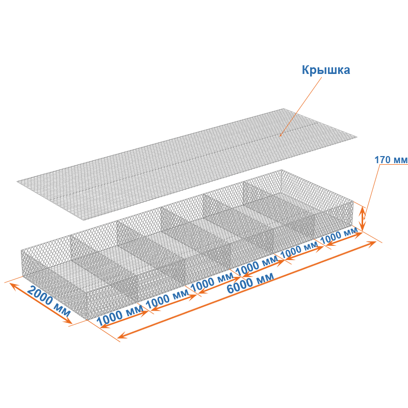 Габионные матрасы Рено 6x2x0,17: ячейка 60х80, диаметр проволоки 2,2 мм, покрытие Цинк.